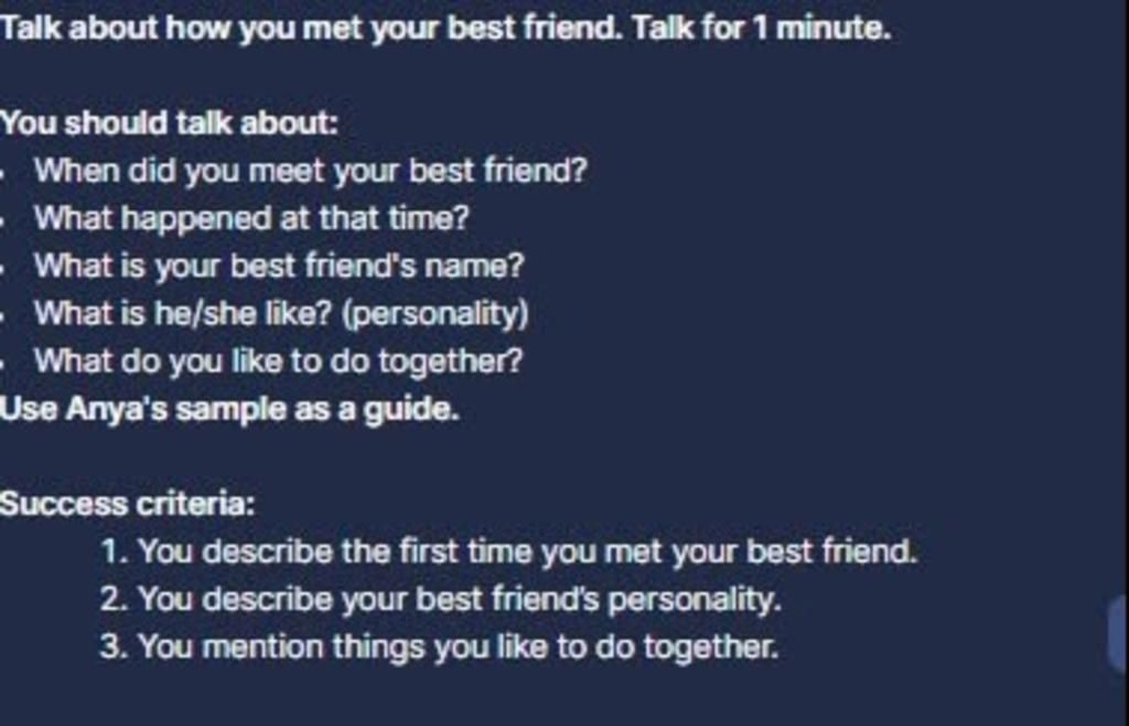 Tôi đã gặp người bạn thân nhất của mình ba năm trước khi chúng tôi bắt đầu học trung học. Đó là ngày đầu tiên đến trường, và tôi cảm thấy lo lắng vì tôi không biết ai. Tôi ngồi cạnh một cô gái mỉm cười với tôi và hỏi tôi có muốn chia sẻ cuốn sách của cô ấy không vì tôi đã quên tôi. Đó là cách mà tôi đã gặp hồng. Hồng là người tốt bụng, hài hước. Cô ấy luôn giúp mọi người và biết cách làm cho mọi người cười, ngay cả vào những ngày tồi tệ. Chúng tôi thích làm nhiều việc cùng nhau. Chúng tôi thường học trong thư viện sau giờ học, đi mua sắm vào cuối tuần và đôi khi nướng bánh tại nhà cô ấy. Chúng tôi cũng thích xem phim và trò chuyện hàng giờ. Cô ấy không chỉ là người bạn thân nhất của tôi, cô ấy giống như một người chị với tôi.