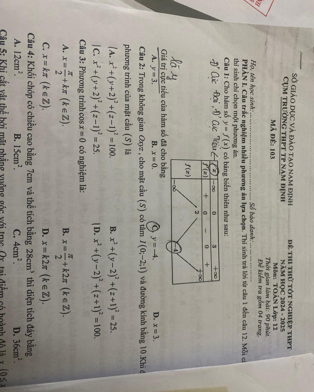 Mặt cầu `(S)` tâm `I(0;-2;1)`, `d=10 -> R=5` có phương trình: