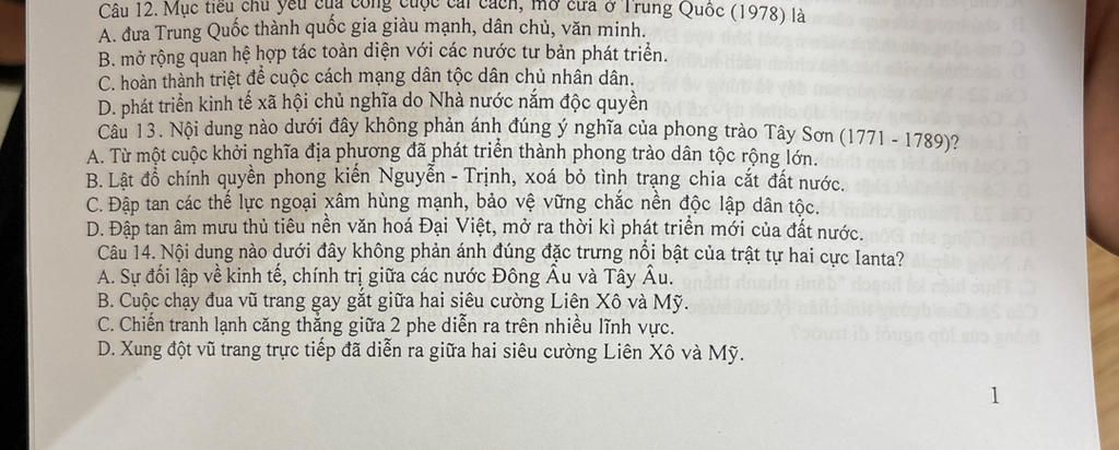Câu 12: `A.` Đưa Trung Quốc thành quốc gia giàu mạnh, dân chủ, văn minh