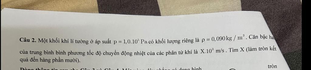 \overline v = \sqrt {\dfrac{{3p}}{\rho }} = \sqrt {\dfrac{{{{3.1.10}^5}}}{{0,09}}} \approx 1825\left( {m/s} \right) \approx 1,{8.10^3}\left( {m/s} \right)\\
