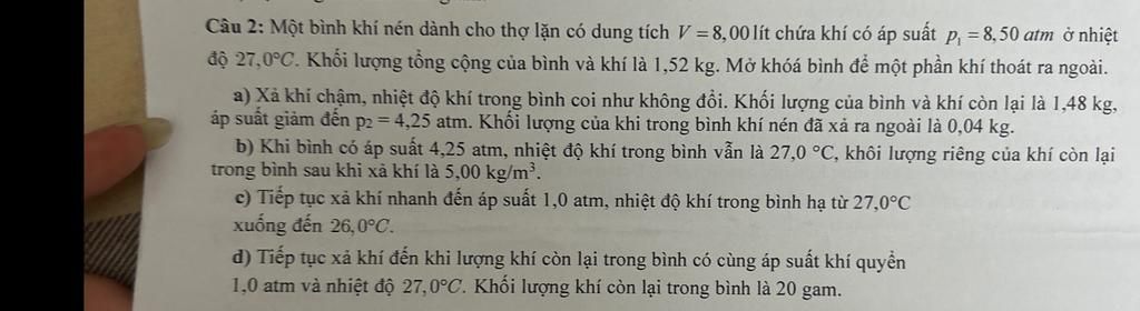 `-` Khối lượng khí đã xả ra là: `m_(xả)=m_1-m_2=1,52-1,48=0,04(kg)`