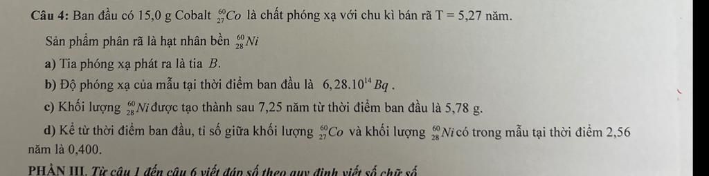 c) Số hạt nhân \({}_{28}^{60}Ni\) tạo thành = số hạt nhân \({}_{27}^{60}Co\) bị phân rã.