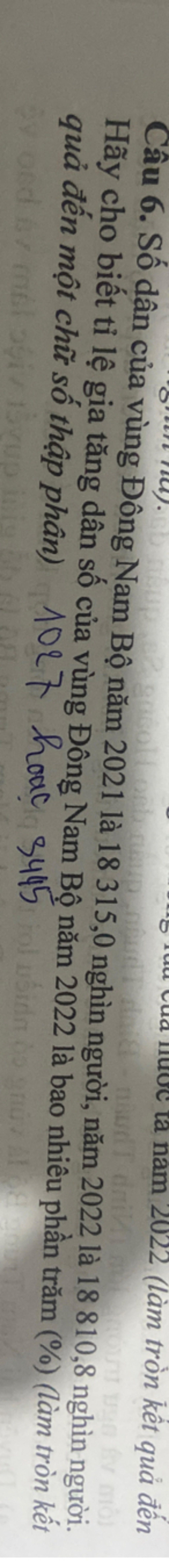 Câu 6. Số dân của vùng Đông Nam Bộ năm 2021 là 18 315,0 nghìn người, năm 2022 là 18 810,8 nghìn người.