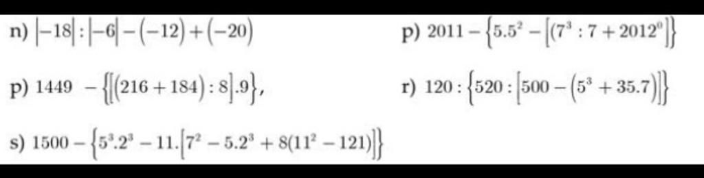 p) `2011 - {5 . 5^2 - [(7^3 : 7 + 2012^0)]}`