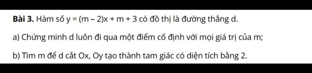 Vậy giao điểm của `(d)` với trục `Ox` là: `A((-m-3)/(m-2);0)`