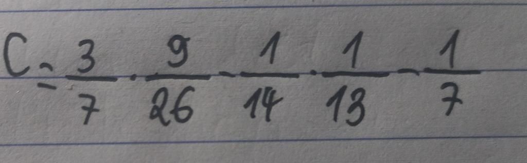 `C` = `3/7` x `9/26` `-` `1/14` x `1/13` `-` `1/7`