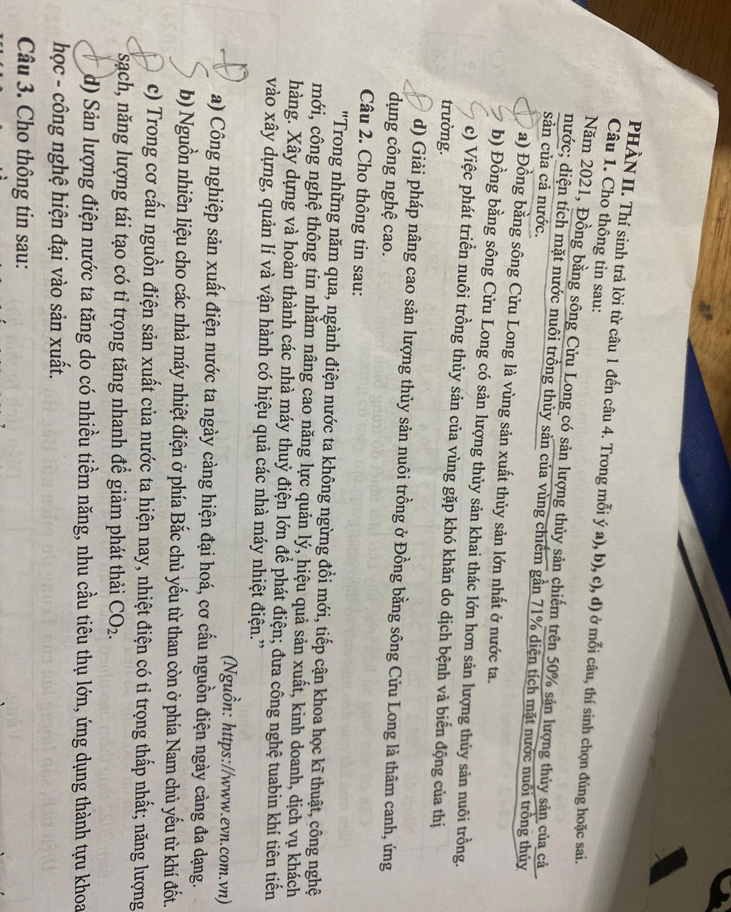 PHẦN II. Thí sinh trả lời từ câu 1 đến câu 4. Trong mỗi ý a), b), c), d) ở mỗi câu, thí sinh chọn đúng hoặc sai.