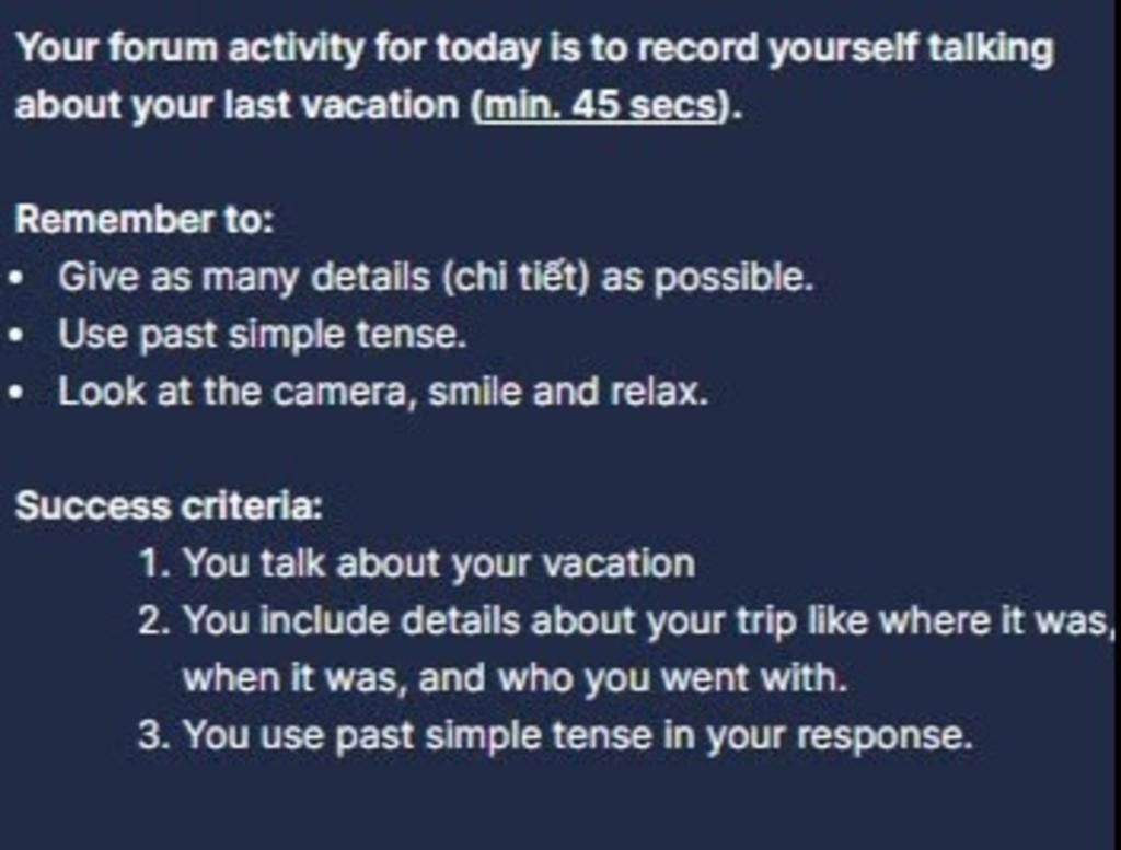 Mùa hè năm ngoái, tôi đã có một kỳ nghỉ tuyệt vời cùng gia đình ở Đà Nẵng. Chúng tôi đi đến đó bằng máy bay và ở lại năm ngày. Thời tiết nắng ấm, rất thích hợp để bơi lội. Chúng tôi đã tham quan nhiều địa điểm nổi tiếng như bãi biển Mỹ Khê, Bà Nà Hills và cầu Rồng. Tôi đã chụp rất nhiều ảnh và ăn nhiều món ngon, đặc biệt là hải sản. Phần tôi thích nhất là tham quan Sun World và đi cáp treo, thật tuyệt vời! Tôi đi cùng bố mẹ và em gái. Chúng tôi đã có khoảng thời gian rất vui vẻ bên nhau. Đó là một trong những kỳ nghỉ tuyệt nhất mà tôi từng có. Tôi hy vọng sẽ được quay lại đó vào một ngày nào đó.