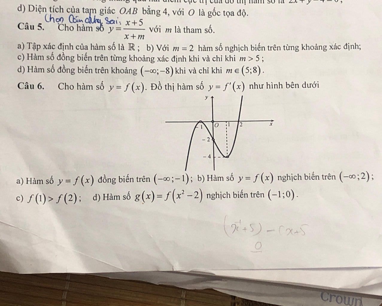 c.Từ đồ thị $\to x\in(1, 2)\to f'(x)<0$