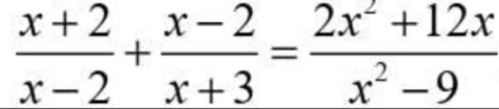 `<=> (x + 2)/(x - 2) + (x - 2)/(x + 3) = (2x^2 + 12x)/((x - 3)(x + 3))`