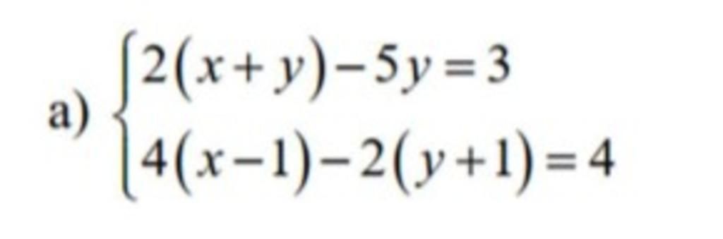`{(2(x + y) - 5y = 3),(4(x - 1) -2(y + 1) = 4):}`