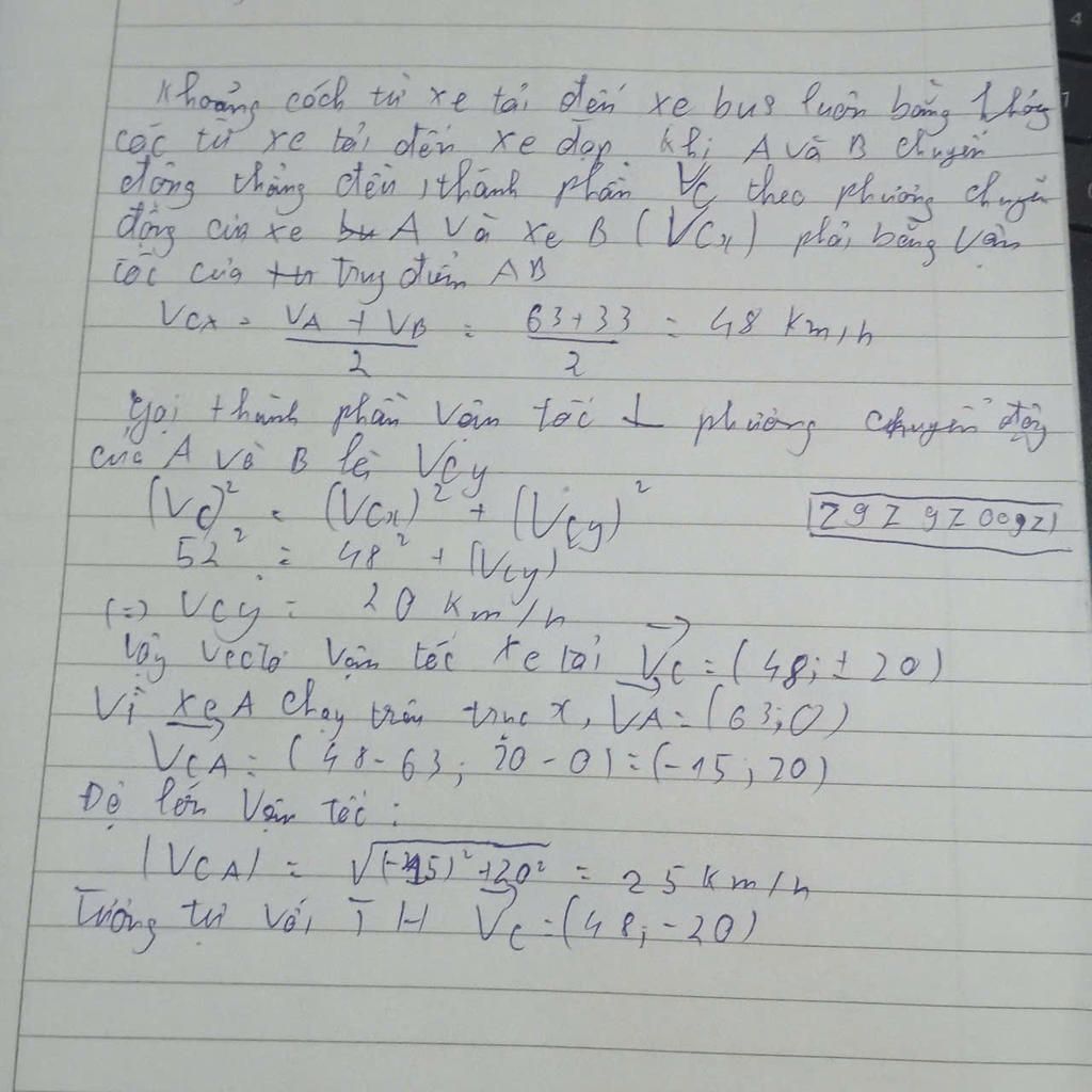 Một xe buýt và một xe đạp chạy trên cùng một đường thẳng và cùng chiều với tốc độ không đổi lần lượt là 63 km/h và 33 km/h Một xe tải chạy trên một đường thẳng khác với tốc độ không đổi là 52 km/h khoảng cách từ xe tải đến xe buýt luôn bằng khoảng cách từ xe tải đến xe đạp. Tìm vận tốc của xe tải đối với xe buýt, gọi xe buýt là A, xe đạp là B, xe tải là C