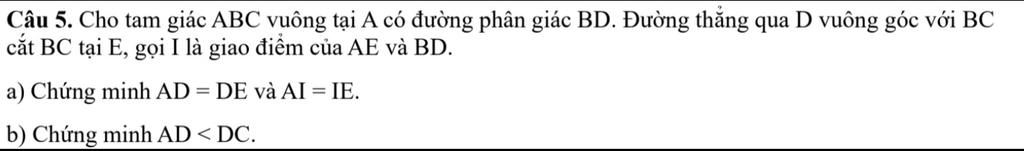 `\hat (ABD)= \hat (EBD) (BD` là đường phân giác của `\hat (ABC))`