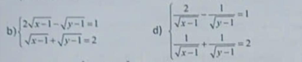 `{(2/(\sqrt(x-1))-1/(\sqrt(y-1))=1),(1/(\sqrt(x-1))+1/(\sqrt(y-1))=2):}\ (x>1;y>1)`