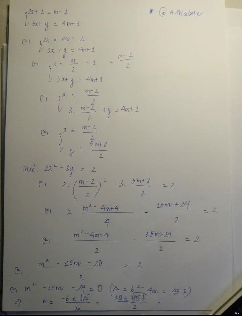 vậy với `m={(19-sqrt(457))/2;(19+sqrt(457))/2}` thì hpt có nghiệm `(x;y)` thỏa mãn `2x^2-3y=2`