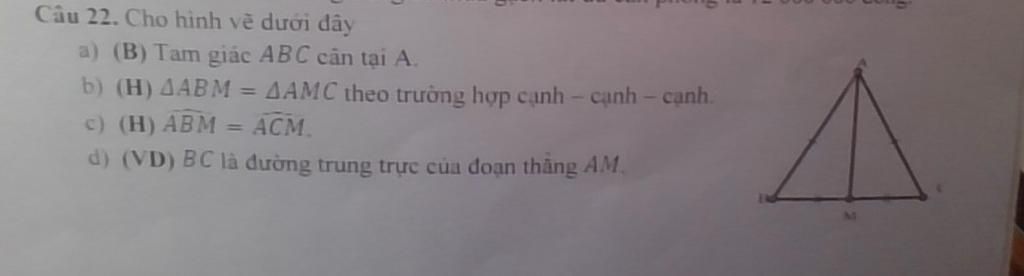 `=>` `\triangle` `ABM` `=` `\triangle` `ACM` `(c.c.c)` (Đúng)