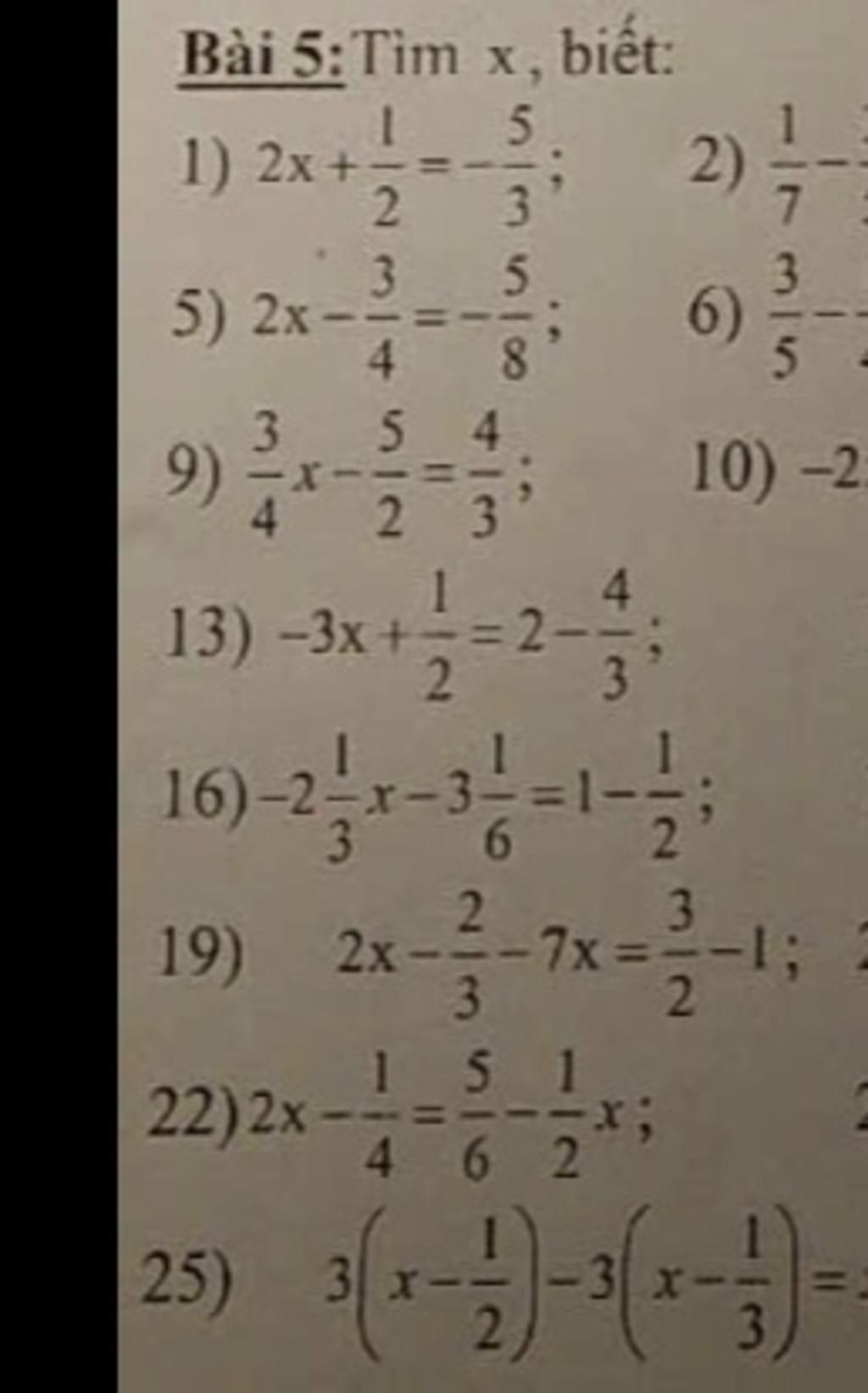 $\begin{align}\textbf{1$\bigg)$ } 2x + \dfrac{1}{2} &= -\dfrac{5}{3} \\ 2x &= -\dfrac{5}{3} - \dfrac{1}{2} \\ 2x &= -\dfrac{13}{6} \\ x &= -\dfrac{13}{6} : 2 \\x &= -\dfrac{13}{12} \end{align}$