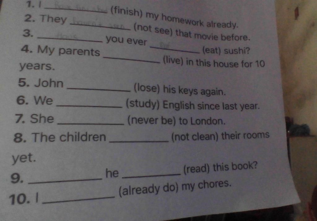 phủ định: S+ haven't/hasn't `V_{2}` + O