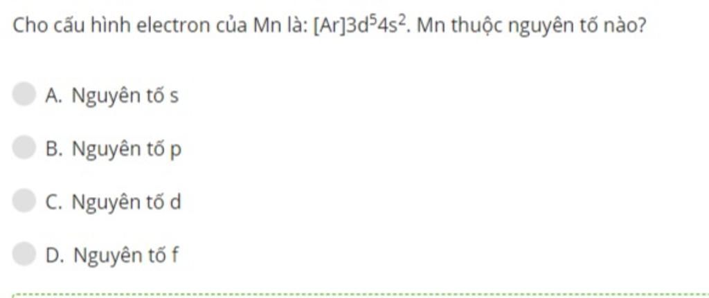 $ \circ$ Electron cuối là 3d⁵ → nằm ở phân lớp d