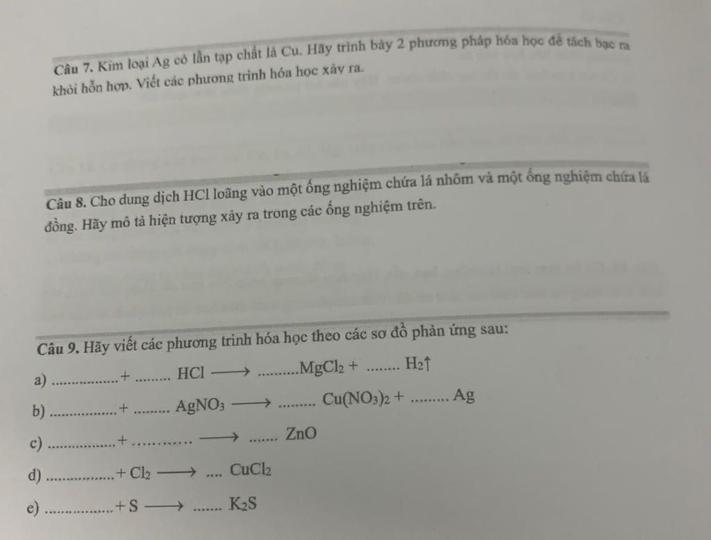 Câu 7: Ta dùng dung dịch Fe(NO3)3 dư để tách Cu ra khỏi Ag,ta có các PT: