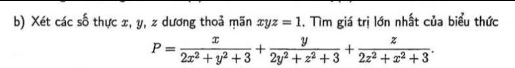 Vậy `P_{max} = 1/2` khi `x =y = z = 1`