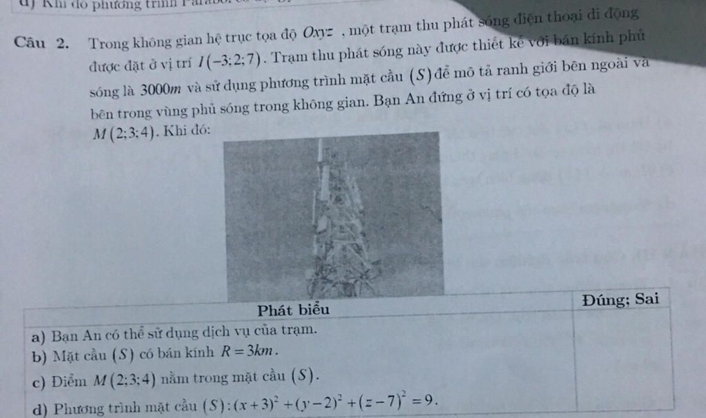 Ta có: $I(-3, 2, 7)$ là tâm và $R=3$ km là bán kính của $(S)$