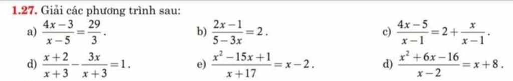 `a)` `(4x - 3) / (x - 5) = 29 / 3` `(`ĐK: `x != 5)`