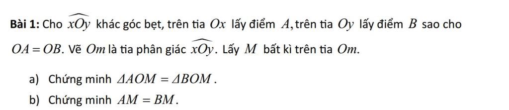 Bài 1: Cho xOy khác góc bẹt, trên tia Ox lấy điểm A, trên tia Oy lấy điểm B sao cho