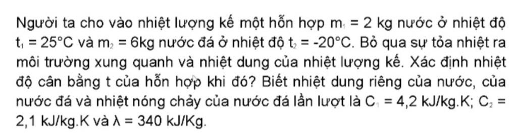 t = 25°C và m = 6kg nước đá ở nhiệt độ t) = -20°C. Bỏ qua sự tỏa nhiệt ra