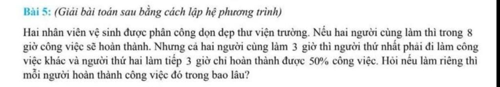 Theo bài : Nếu cả hai người cùng làm `3` giờ thì người thứ nhất làm công việc khác và người thứ hai làm trong `3` giờ thì hoàn thành `50%` công việc