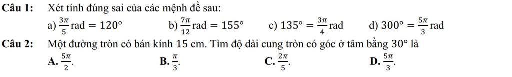 `=>`Độ dài cung tròn `:15 . 1/6 pi=5/2 pi`