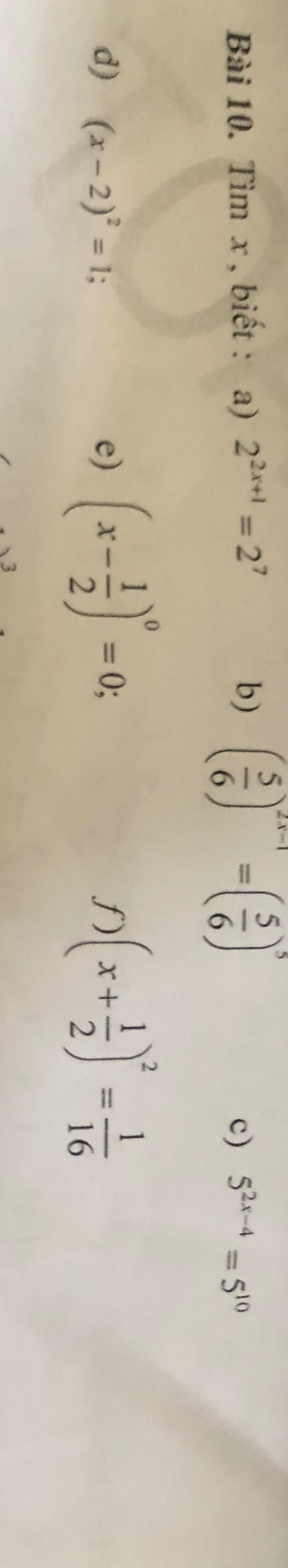 `e)` `(x-1/2)^0=0` Ta có: Mọi số khác `0` nâng lên lũy thừa `0` đều bằng `1` `(` `a^0 =1` `)` Vậy phương trình trên vô nghiệm.