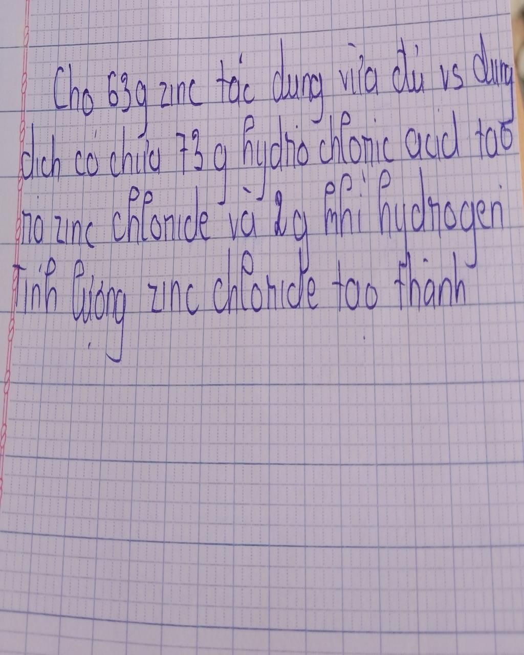 $\Rightarrow m_{zinc \ chloride} = 136 - 2 = 134 \text{ (g)}$