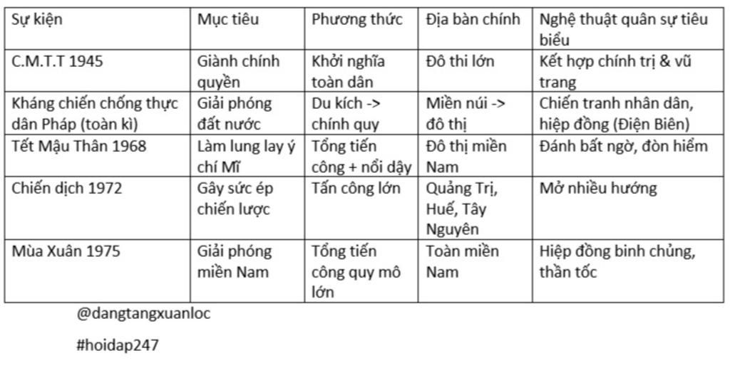 - Giải thích: Nông thôn là địa bàn chủ đạo để phát triển lực lượng du kích, trong khi các chiến dịch lớn (như chiến dịch Điện Biên Phủ trên không 1972, chiến dịch Hồ Chí Minh 1975) tập trung vào các mục tiêu chiến lược ở đồng bằng và đô thị.