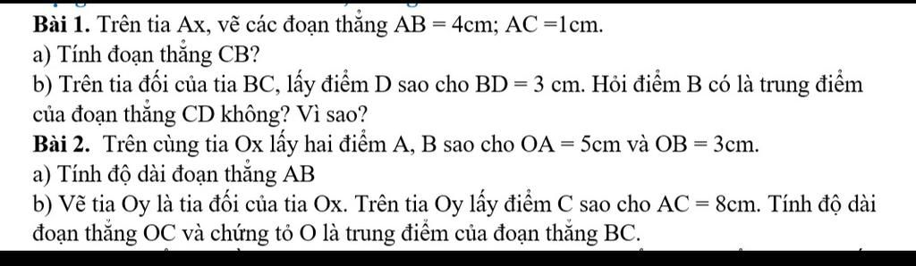 Bài 1. Trên tia Ax, vẽ các đoạn thẳng AB = 4cm; AC=1cm.