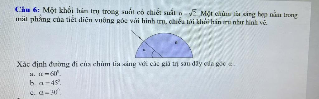 Câu 6: Một khối bán trụ trong suốt có chiết suất n=v2. Một chùm tia sáng hẹp nằm trong