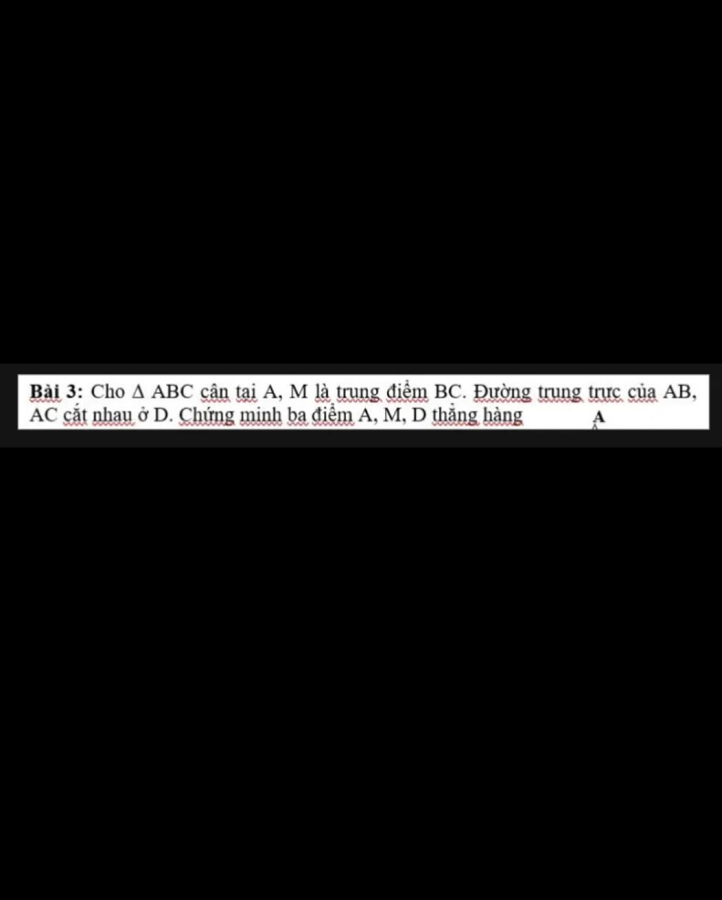 `-` Trong tam giác cân , đường trung tuyến ứng với cạnh đáy cũng chính là Đường cao , Đường p/g , Đường trung trực ⇒ tâm đường tròn ngoại tiếp tam giác ABC, điểm D cũng nằm trên đường trung trực của BC, mà đường trung trực của BC chính là đường thẳng AM