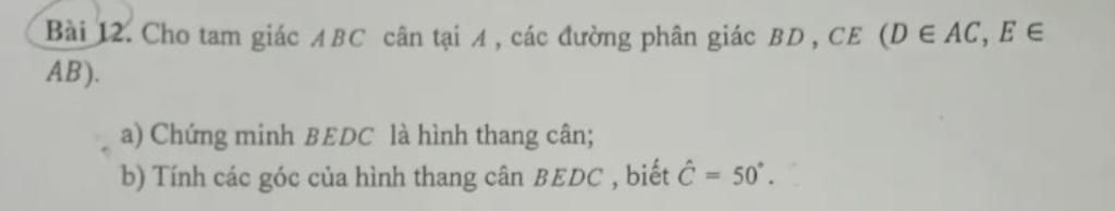 `hat(EBC)=hat(DCB)(` do `\Delta ABC` cân tại `A)`