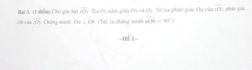 Cho góc bẹt Xoy. Tia Oz nằm giữa Ox và Oy. Vẽ tia phân giác Oa của xoz, phân giác Ob của zOy. Chứng minh aOb = 90 độ. Nếu ko hiểu mọi người có thể nhìn vào đề nhé