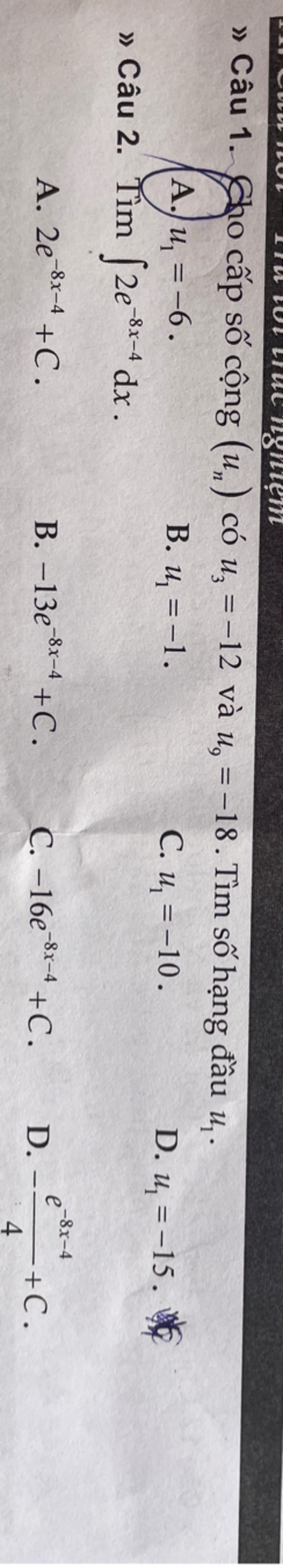 Câu 2: $\int$\( e^{ax + b} \)dx = $\frac{1}{a}$ \( e^{ax + b} \) + C $\\$ $\int$2\( e^{-8x - 4} \)dx = 2( $\frac{1}{-8}$ \( e^{-8x - 4} \) ) + C = -$\frac{1}{4}$ \( e^{-8x - 4} \) + c