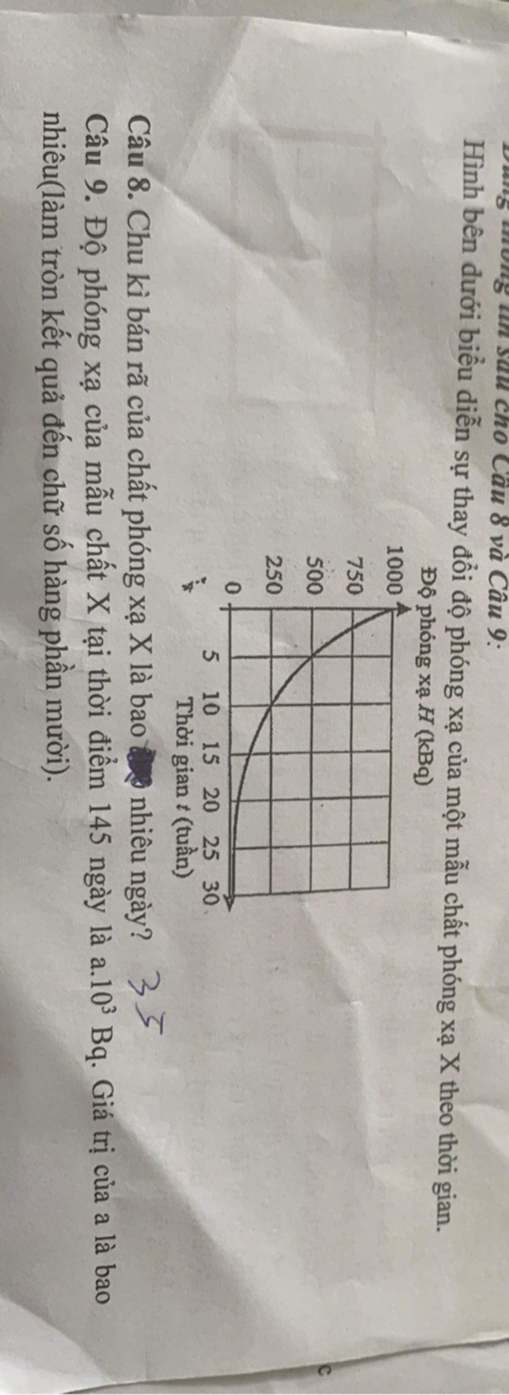 `=>` Thời gian khi độ phóng xạ là `500(kBq)` -> theo đồ thị là 5 tuần = 35 (ngày)