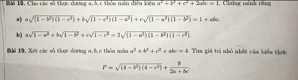 `-` Đặt `a = 2cosA, b = 2cosB, c = 2cosC` với A, B, C là các góc của một tam giác.