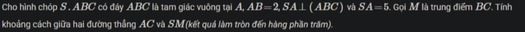 Cho hình chóp S. ABC có đáy ABC là tam giác vuông tại A,AB = 2 ,SA vuông(ABC) và SA = 5 Gọi M là trung điểm BC. Tính khoảng cách giữa hai đường thẳng AC và SM (kết quả làm tròn đến hàng phần trăm).