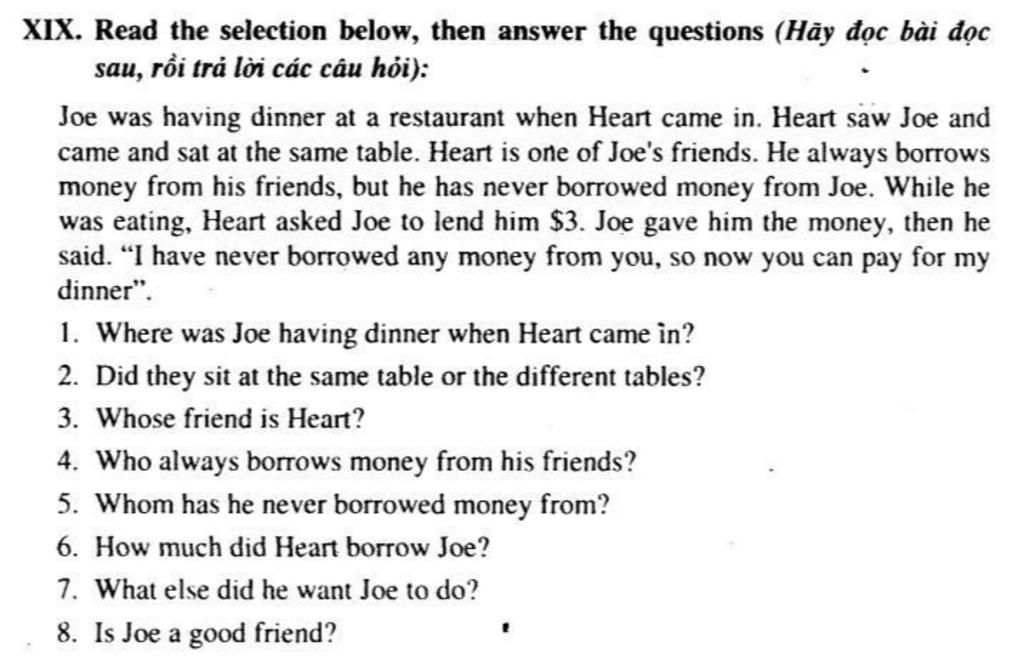 `-` Joe đang ăn tối tại một nhà hàng khi Heart bước vào. Heart nhìn thấy Joe và đến và ngồi xuống cùng bàn với Joe. Hear là một trong những người bạn của Joe. Anh ấy luôn luôn mượn tiền của những người bạn của anh ấy, nhưng anh ấy chưa bao giờ mượn tiền của Joe. Khi anh ấy đang ăn, Heart hỏi Joe cho anh ấy mượn `$3.` Joe đưa anh ấy số tiền đó, sau đấy anh ấy nói. 'Tôi chưa bao giờ mượn tiền từ bạn, nên bây giờ bạn có thể trả tiền cho bữa tối'.