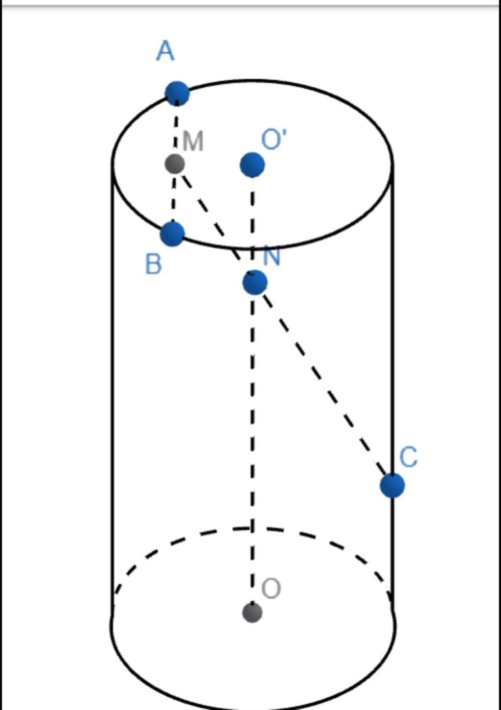 [SDL] Câu 5: Cho hình trụ có kích thước R = 1 mét , h= 4m (hình bên dưới). Một mặt phẳng cắt xiên hình trụ đã cho được thiết diện S. S cắt đường tròn tâm O’ tại A,B sao cho đoạn AB = sqrt(3) mét , S cắt mặt bên của hình trụ theo đường cong (gọi C thuộc đường cong đó sao cho khoảng cách từ C đến mặt đáy trụ là là nhỏ nhất khi đó d(C),đáy) = 1 mét). Gọi M là trung điểm của AB , MC cắt OO’ tại N sao N phải thuộc đoạn OO’. Tính thể tích V (m^3) là thể tích giới hạn bởi thiết diện S, mặt trên của hình trụ và mặt bên của trụ (kết quả làm tròn đến hàng phần trăm)