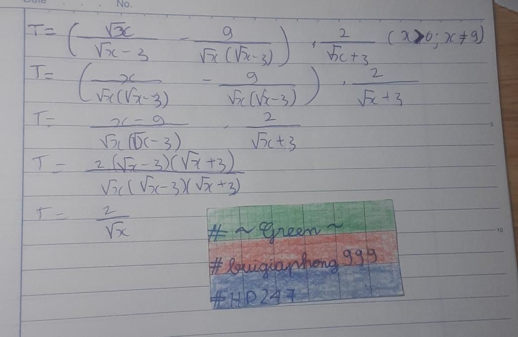`T = ( sqrtx/(sqrtx-3) - 9/(sqrtx(sqrtx-3)) ) . 2/(sqrtx+3)` `( ĐKXĐ : x > 0 ; x \ne 9 )`
