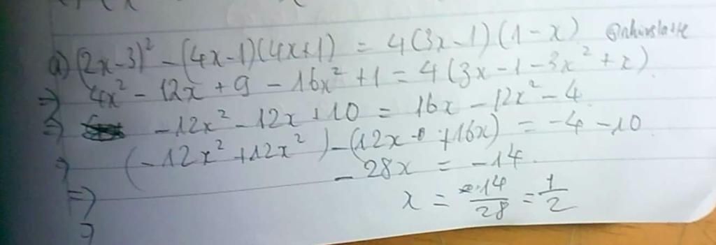 `(2x-3)^2 - (4x-1)(4x+1) = 4(3x-1)(1-x)`