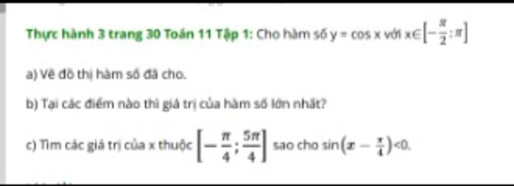 Thực hành 3 trang 30 Toán 11 Tập 1: Cho hàm số y = cos x với xé g