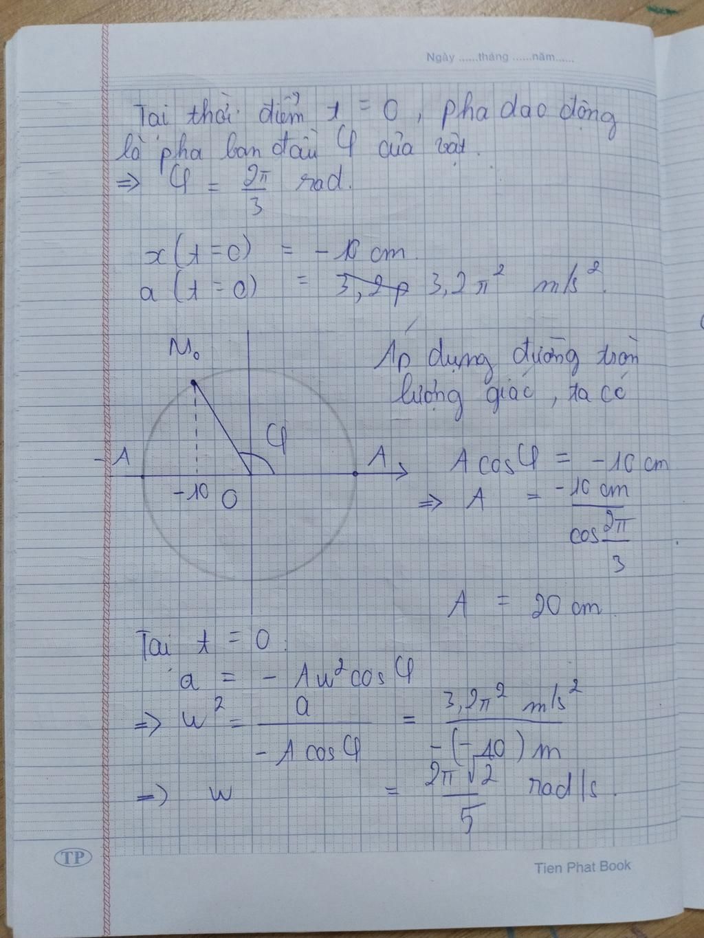 cho vật dao dộng điều hòa lúc t = 0, vật có pha dao dộng = 2pi/3, li độ = -10cm, gia tốc = 3,2pi^2 m/s^2. a) Xác định trạng thái vật lúc t = 1s b) Xác định thời điểm đầu tiên vật có pha dao động = pi/3 c) Xác định thời điểm vật có li độ = 10 căn 2 cm lần đầu tiên