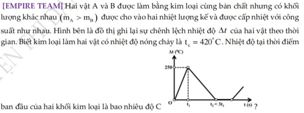 Lại có sau $t_1$ thì vật $m_B$ bắt đầu nóng chảy còn sau $t_2$ thì vật $m_A$ bắt đầu nóng chảy.